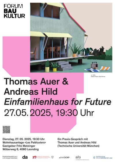Das Forum Baukultur lädt zum Praxis-Gespräch mit Thomas Auer und Andreas Hild. Gastgeber ist Fritz Matzinger. Forum Baukultur bestehend aus Kammer der Ziviltechniker:innen | Architekt:innen und Ingenieurkonsulent:innen für Oberösterreich und Salzburg, das architekturforum oberösterreich sowie die Zentralvereinigung der Architekt:innen Österreichs und Landesverband Oberösterreich.