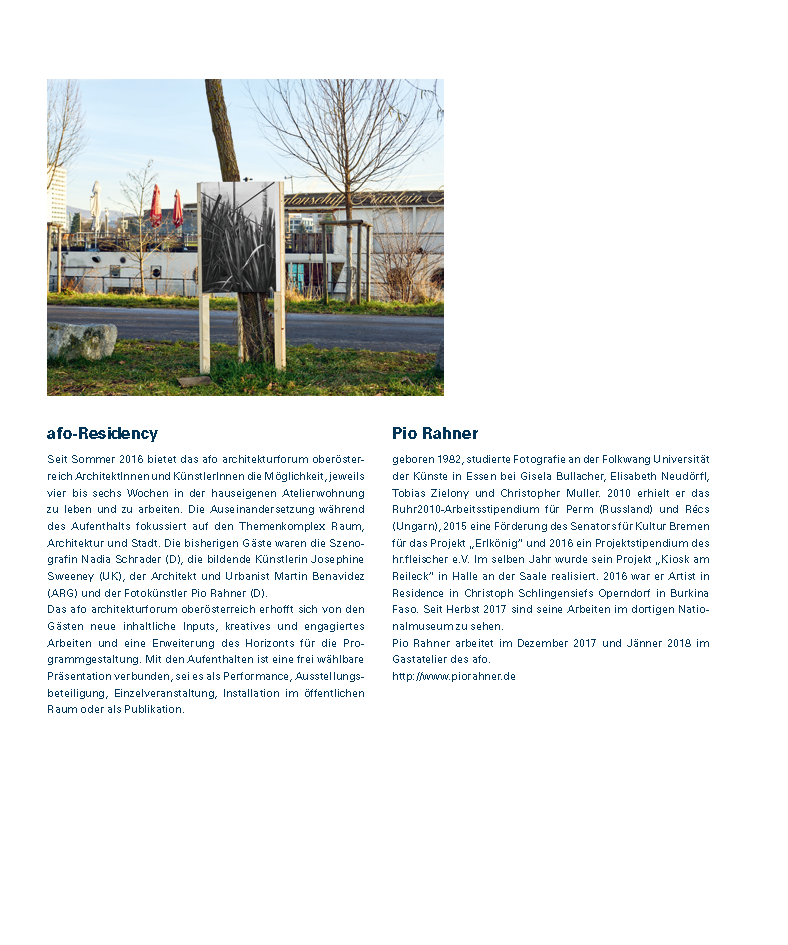 PublikationSeit Sommer 2016 bietet das afo architekturforum oberösterreich ArchitektInnen und KünstlerInnen die Möglichkeit, jeweils vier bis sechs Wochen in der hauseigenen Atelierwohnung zu leben und zu arbeiten. Die Auseinandersetzung während des Aufenthalts fokussiert auf den Themenkomplex Raum, Architektur und Stadt. Die bisherigen Gäste waren die Szenografin Nadia Schrader (D), die bildende Künstlerin Josephine Sweeney (UK), der Architekt und Urbanist Martin Benavidez (ARG) und der Fotokünstler Pio Rahner (D).