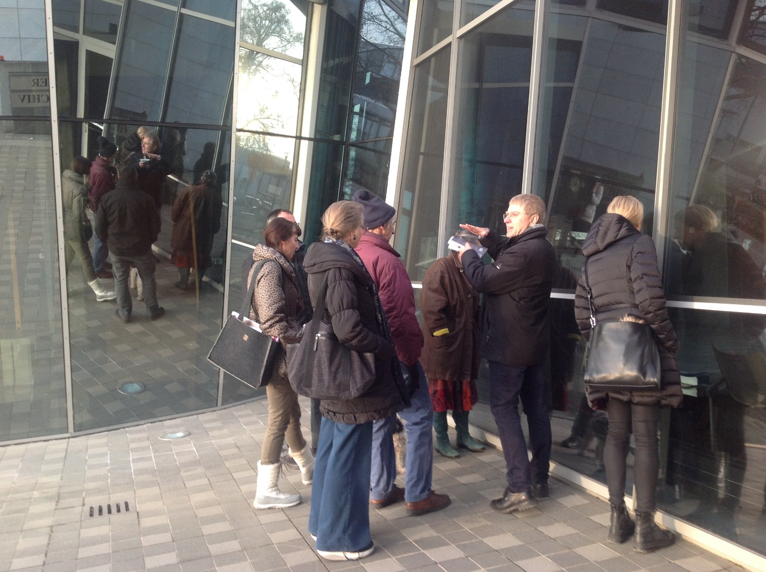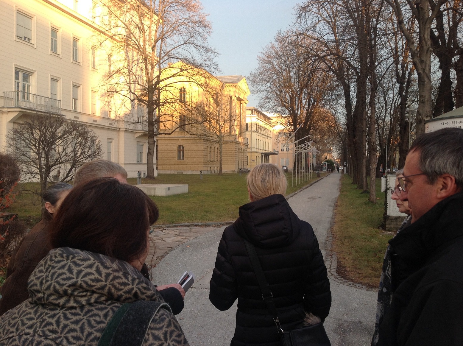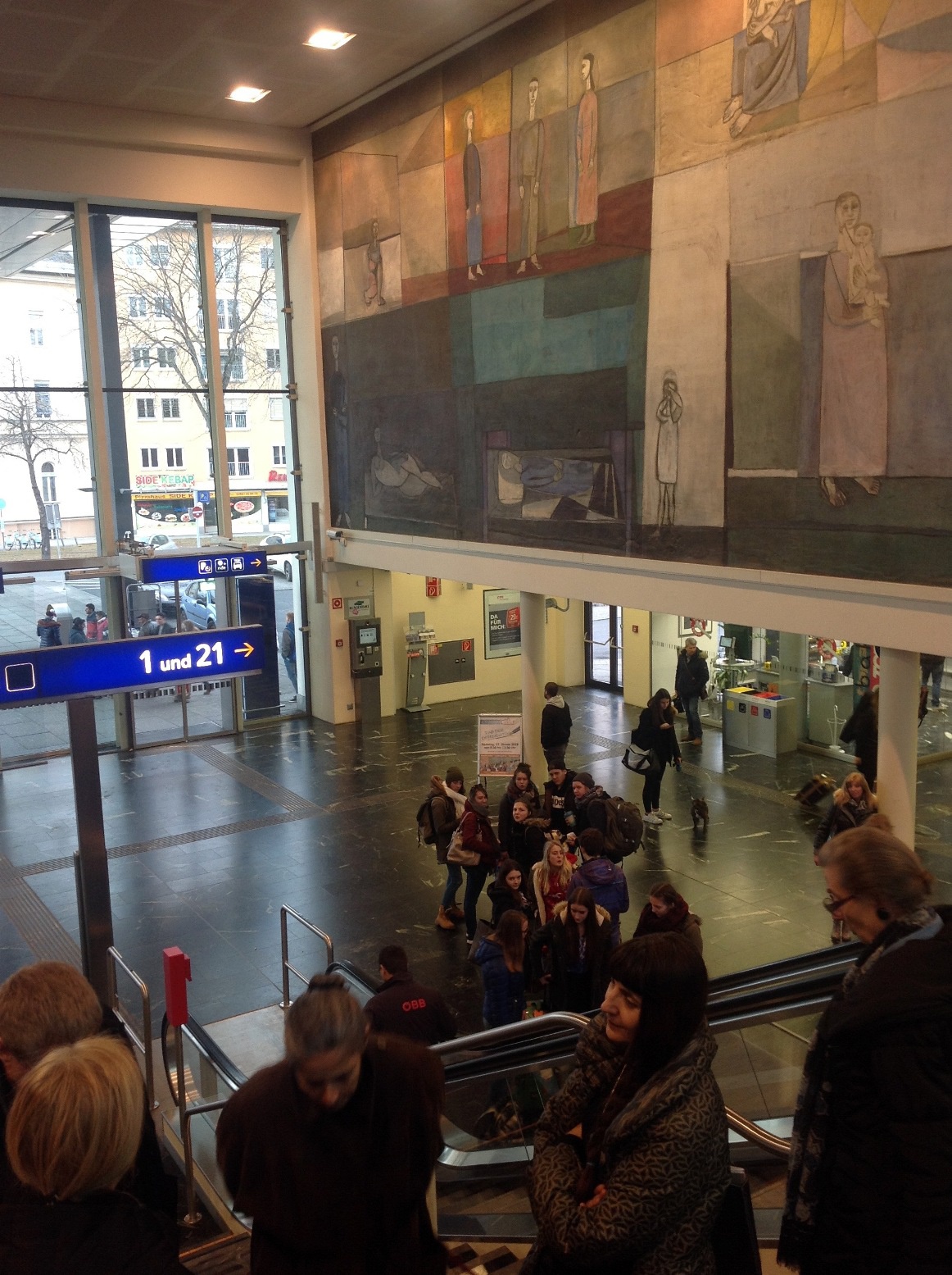 Wir machten uns gemeinsam auf den Weg durch Klagenfurt und entdeckten „Kunst am Bau“ im öffentlichen Raum. Startpunkt war die Eingangshalle im Hauptbahnhof Klagenfurt mit den bekannten Fresken von Giselbert Hoke. Über den Bahnhofsplatz, das Musil Literaturmuseum, das Landesarchiv, der WIMO, dem Verwaltungszentrum, dem Konzerthaus, der HTL und dem Amalienhof ging es Richtung Künstlerhaus und Architektur Haus Kärnten. Hier bot sich die Möglichkeit zum Besuch der Ausstellung „AUF DIE PLÄTZE – NA MESTA“.