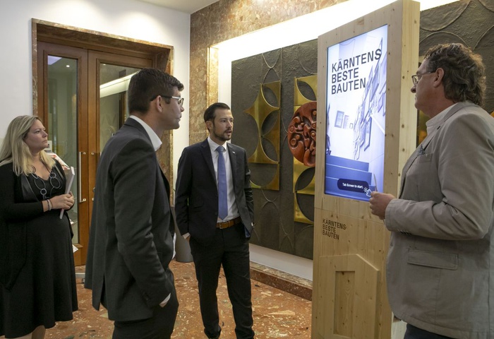 Die interaktive Wanderausstellung „Kärntens beste Bauten“ tourt seit Juni 2023 durch das Land. Kürzlich machte sie im Amt der Kärntner Landesregierung Station. Landeshauptmann Peter Kaiser, LHStv.in Gaby Schaunig, LHStv. Martin Gruber, Landesrätin Beate Prettner, Landesrat Daniel Fellner, Landesrätin Sara Schaar und Landesrat Sebastian Schuschnig erprobten gemeinsam das interaktive Ausstellungstool und informierten sich über die ausgezeichneten Bauwerke. Bis Mai 2024 wandert die Ausstellung quer durch das Land und wird von einem Programm aus Vorträgen und Workshops begleitet.