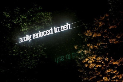 Nach Erlöschen des Feuers und mit dem Aufsteigen der Rauchwolken erhellte sich als Abschluss die Neonschrift „a city reduced to ash“ zwischen den Bäumen im Achterjägerpark (Foto 5).