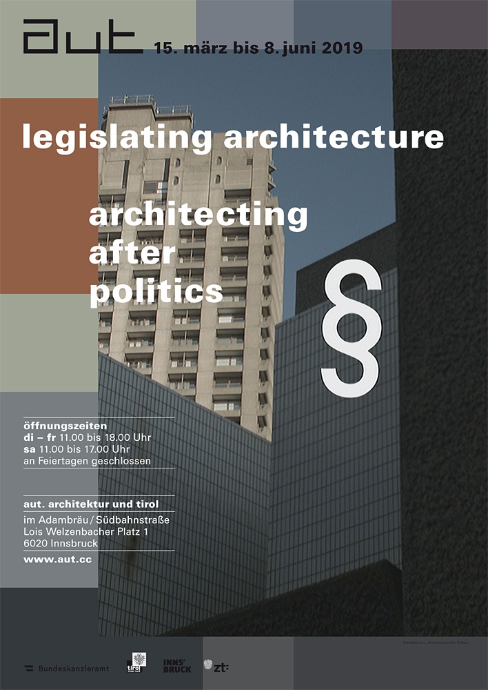 Die Ausstellung „Legislating Architecture | Architecting after Politics“ im aut baut auf der für das vai konzipierten, gleichnamigen Ausstellung auf. In räumlich und inhaltlich erweiterter Form werden die verschiedenen Themenfelder innerhalb der Auseinandersetzung mit Architektur, Politik und Wirtschaft vorgestellt und entlang eines Parcours einer breiteren Öffentlichkeit zugänglich gemacht. Die räumliche Inszenierung wird für das aut um ein Fernseh- und Lesezimmer ergänzt, in dem das Tun und Handeln zwischen Architektur und Politik im Vordergrund stehen und die Besucherinnen gefordert werden: Don´t complain. Design a strong argument!