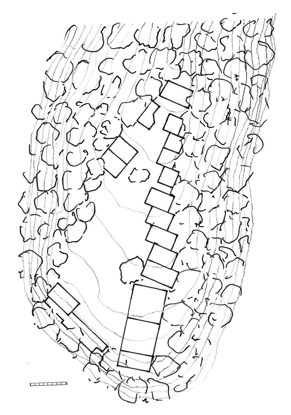 Dank an die Gemeinde Telfes für die Übermittlung eines exakten Lageplans der Anlage, den ich überarbeitet und mit prinzipiellen Schichtenlinienverläufen ergänzt habe.