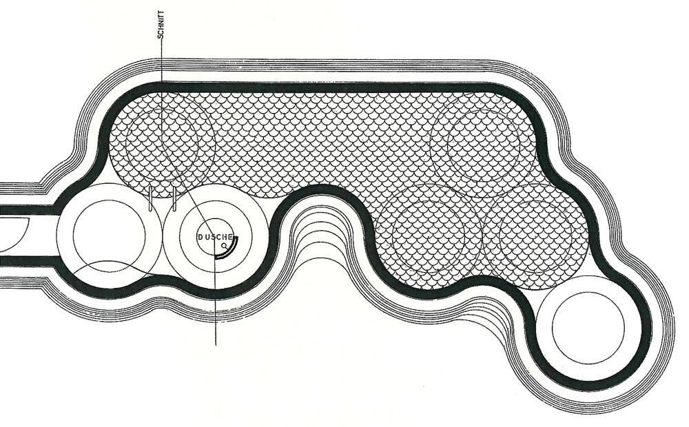 Wer weiß, in welcher Jahreszeit Josef Lackner diesen Auftrag entwickelt hat. Ich vermute fast in der unwirtlichen Winterzeit. Sein Text zum Projekt1, der wie das Bad selbst, durch seine poetische Beschreibung der Licht- und Jahreszeitenverhältnisse eine Sonderstellung in seinen Projekttexten einnimmt, reflektiert auf Höhenlage und Klima, die Art des Schwimmens und das Licht, sogar auf Sonne und Mond, Baumkronen und Farben des Himmels, aber kein Wort zur Konstruktion. Neben dem bürgerlichen, orthogonal eingeteilten, villenartigen Haus, in dem ganz oben unter Dach, nach Süden blickend, der groß gewachsene, ganz und gar nicht sportliche Paul Flora seine „Striche strichelte", entstand – skizziert aus Lackners „Pranke“ – dieses „wellige“ Gebilde im verwilderten Garten.