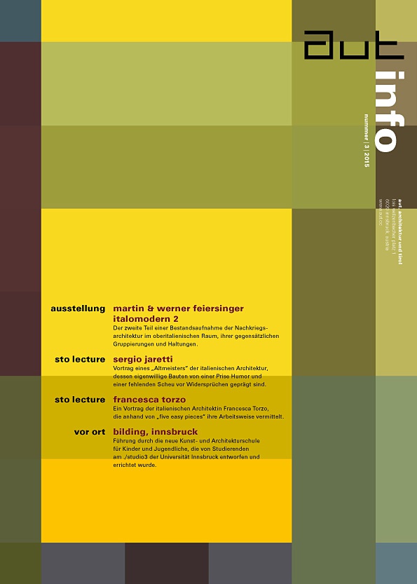 Im Mittelpunkt dieser Ausgabe der aut: info steht die Ausstellung "Italomodern 2" – der zweite Teil einer Bestandsaufnahme der Nachkriegsarchitektur im oberitalienischen Raum, ihrer gegensätzlichen Gruppierungen und Haltungen durch Martin und Werner Feiersinger. Mit dem Fokus auf Unikaten, auf experimentellen, wenn auch nicht unbedingt spektakulären Architekturen, versammeln Ausstellung und die dazu erscheinende Begleitpublikation über 130 Bauten, die klarer Ausdruck jener Phase des wirtschaftlichen und kulturellen Aufschwungs sind, in der man an die architektonische Gestaltbarkeit der Zukunft glaubte. Der geographische Bogen spannt sich dabei von Bozen bis Colle di Val'Elsa, von Triest bis San Remo und von der Adria bis hinauf auf über 2.000 m.