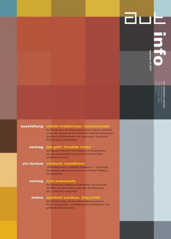 Die aut: info 3/17 bietet auf 4 Seiten einen Einblick in die Geschichte der Talgemeinschaft und in das umfassende Rechercheprojekt von Walter Niedermayr über die spezifische Baukultur im Fleimstal. Außerdem finden Sie Hintergrundinformationen zu den weiteren Veranstaltungen des aut bis Feber 2018, darunter Vorträge von Jan Gehl, Umberto Napolitano (LAN), PAUHOF Architekten und Tom Avermaete zu unterschiedlichen Aspekten der Stadtentwicklung, eine zweite Ausgabe der Reihe "meins" mit Jörg Streli und Manfred Sandner, ein Gespräch zwischen Benedikt Sauer und Walter Niedermayr sowie vier "Vor Ort"-Gespräche bei aktuellen Bauwerken in Tirol. Und natürlich gibt es auch wieder einen "Small is beautiful"-Beitrag von Rainer Köberl, der sich dieses Mal ausgehend von Erfahrungen in Vicenza dem Speziellen und dem Allgemeinen widmet.