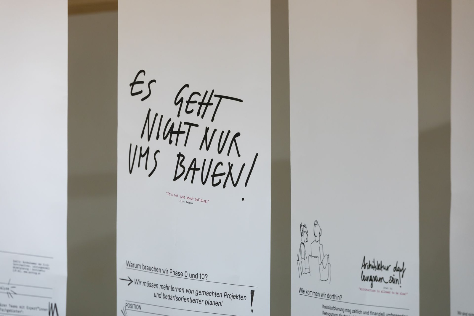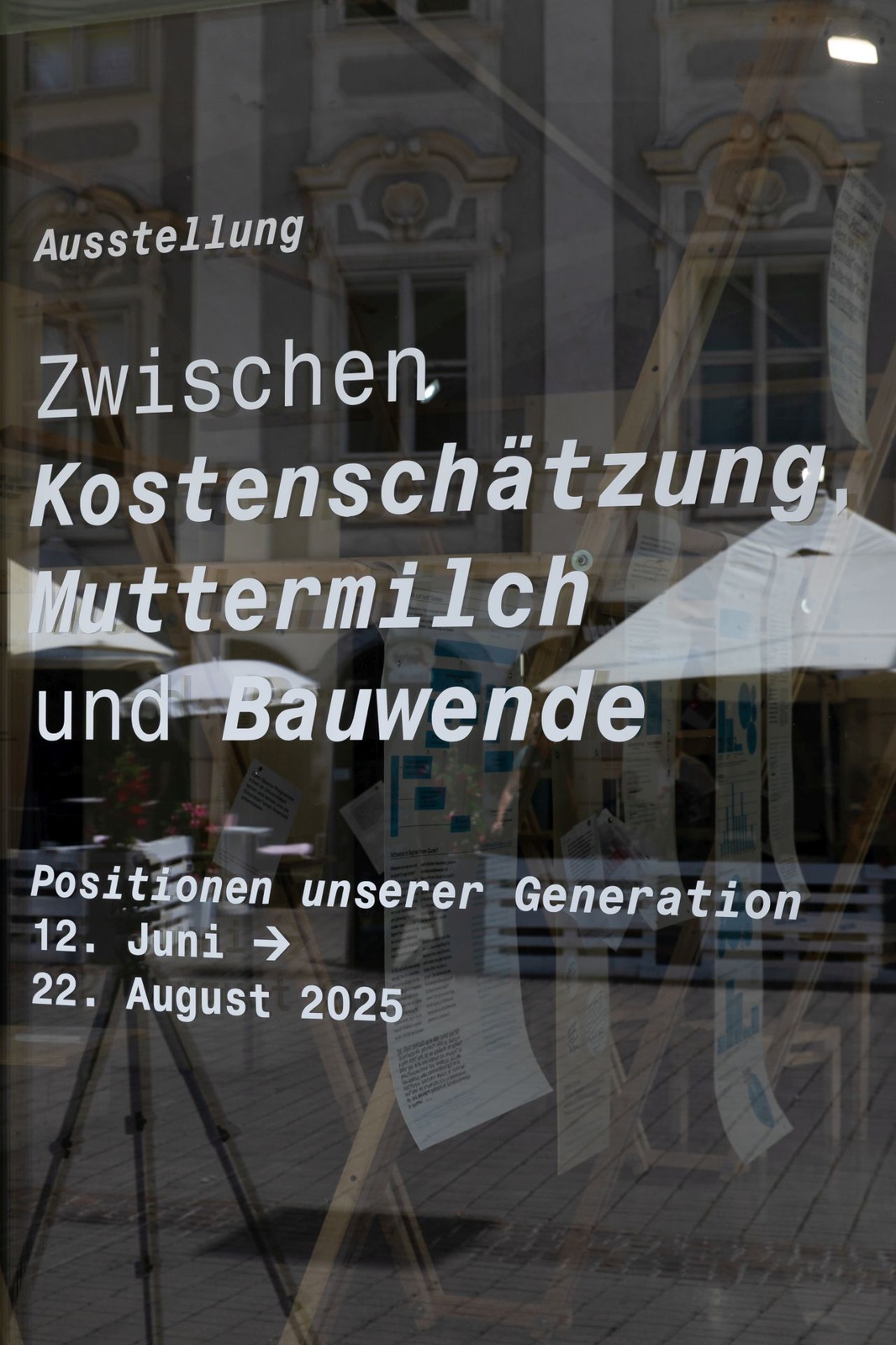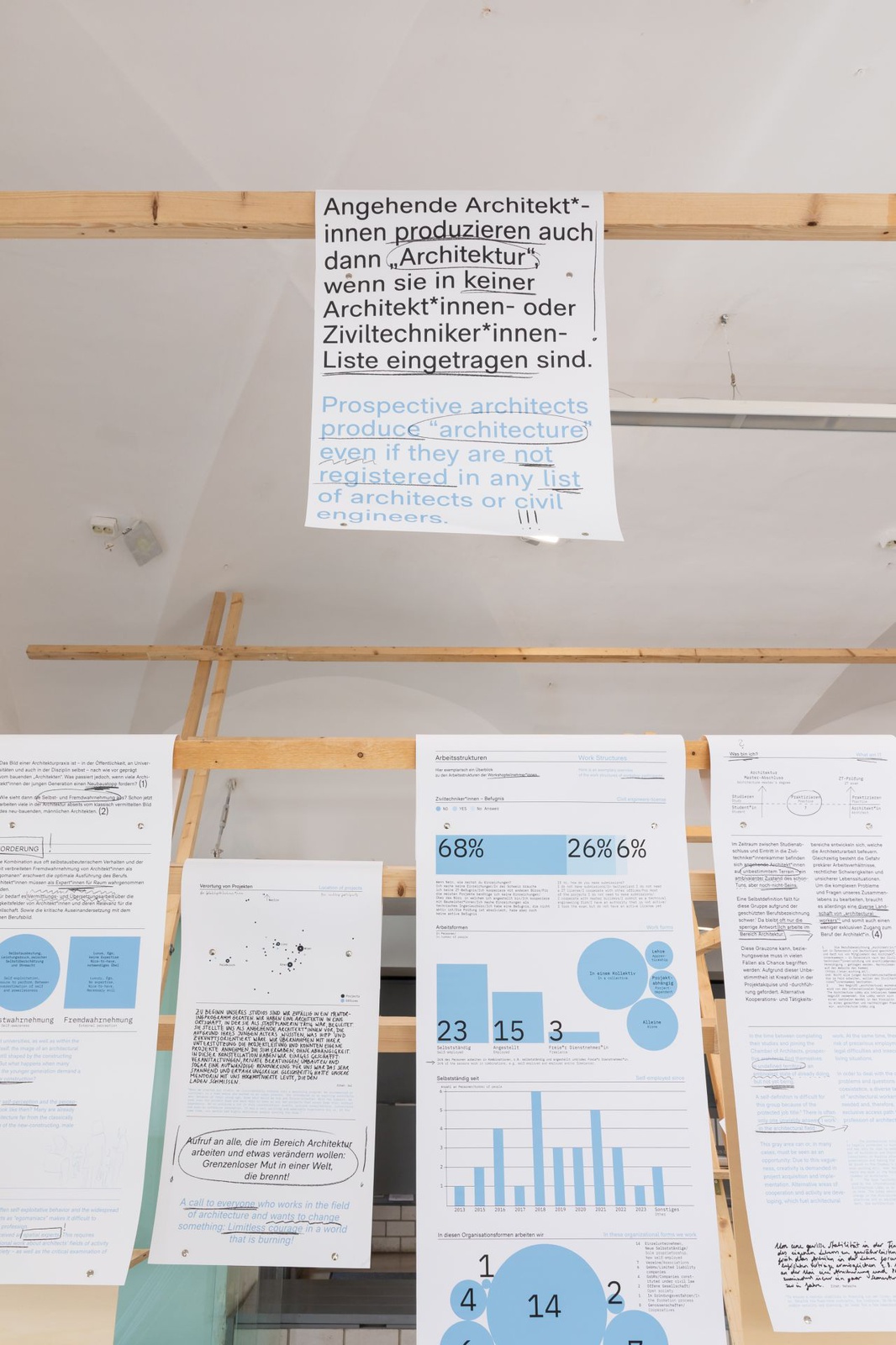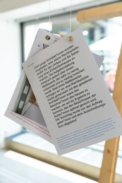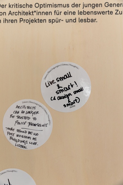AusstellungDie Ausstellung „Zwischen Kostenschätzung, Muttermilch und Bauwende“ versammelt die drängendsten Fragen, Positionen und Forderungen junger Architekt:innen in Österreich. Die Herausforderungen sind groß: die Bauwende aktiv mitgestalten, gerechtere Arbeitsstrukturen schaffen und die eigenen Handlungsspielräume durch veränderte Rahmenbedingungen vergrößern. Gezeigt wird ein kollektiv kuratiertes Mapping, das gemeinsam mit 60 Architekt:innen erarbeitet wurde und den Auftakt zu einer offenen Diskussion bildet. Die Installation lädt zum Austausch ein, stellt Fragen und soll durch Kommentare der Besucher:innen weiter wachsen.