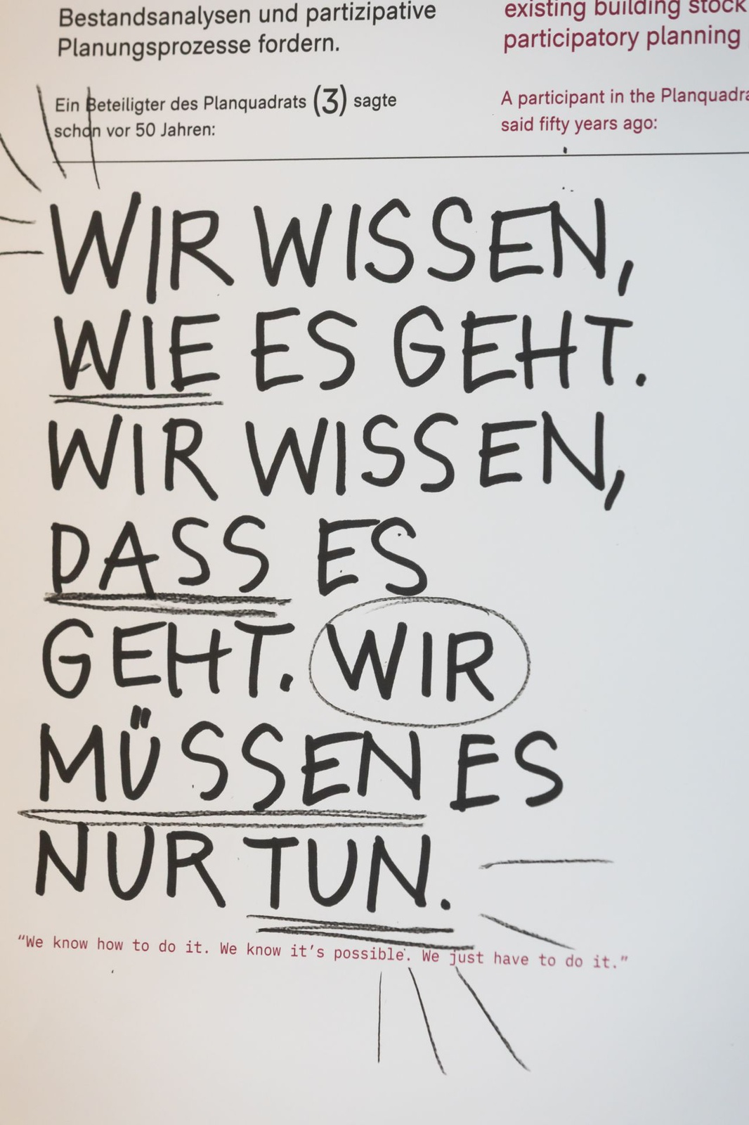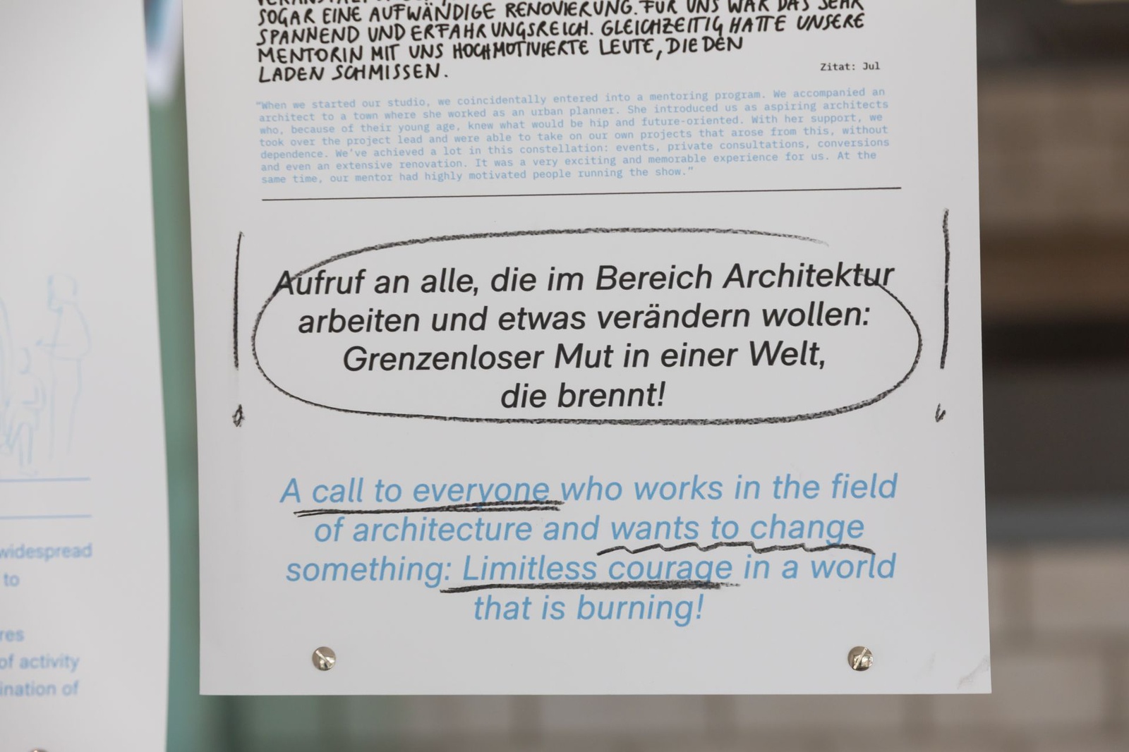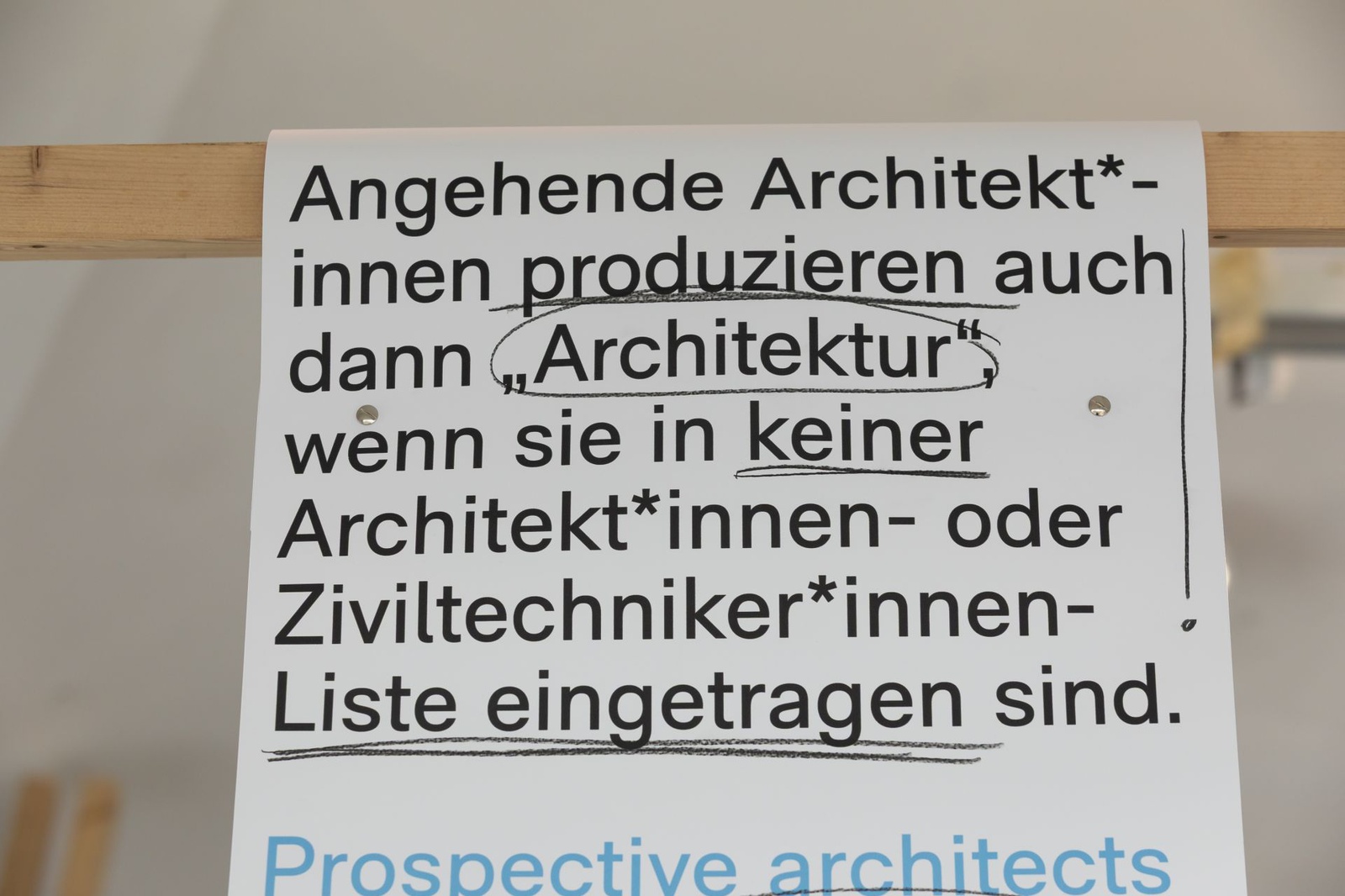 AusstellungDie Ausstellung „Zwischen Kostenschätzung, Muttermilch und Bauwende“ versammelt die drängendsten Fragen, Positionen und Forderungen junger Architekt:innen in Österreich. Die Herausforderungen sind groß: die Bauwende aktiv mitgestalten, gerechtere Arbeitsstrukturen schaffen und die eigenen Handlungsspielräume durch veränderte Rahmenbedingungen vergrößern. Gezeigt wird ein kollektiv kuratiertes Mapping, das gemeinsam mit 60 Architekt:innen erarbeitet wurde und den Auftakt zu einer offenen Diskussion bildet. Die Installation lädt zum Austausch ein, stellt Fragen und soll durch Kommentare der Besucher:innen weiter wachsen.