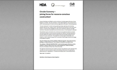 Die Endlichkeit von Material- und Energieressourcen stellt das Bauwesen vor neue Fragestellungen und Aufgaben im Kontext der Herausforderungen des Klimawandels. Die Ausstellung im HDA widmet sich dem Thema "Materialkreislauf". Sie stellt Studien und praktische Beispiele von Architekturen, Umnutzungen und Systemkreisläufen vor, die durch ihre hohe gestalterische Qualität sowie durch ihre beeindruckende Genese aus wiederverwendeten Materialressourcen überzeugen.