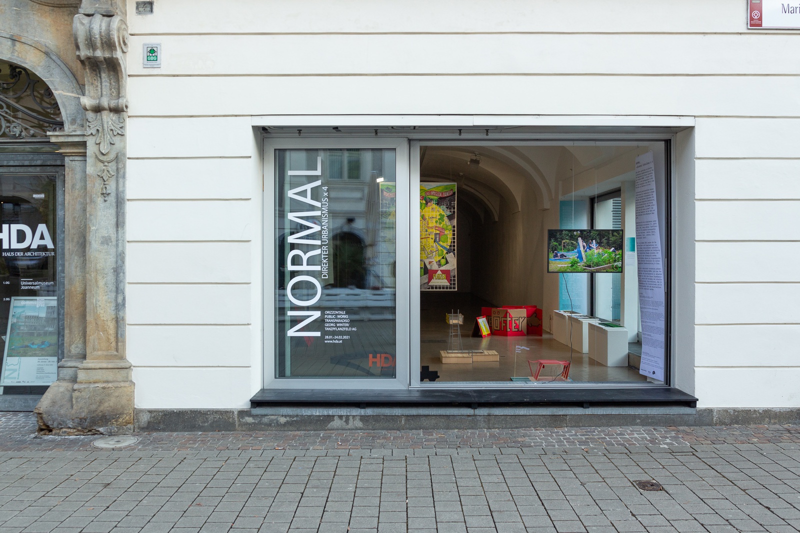 28.01.2021-24.02.2021: How can you define sustainable and future-oriented urban development? “NORMAL – direct urbanism x 4”, initiated by transparadiso, focusses on four districts on the outskirts of Graz. The HDA is accompanying the project with an exhibition held as part of Graz Year of Culture 2020. Responding to current social challenges in urban development, transparadiso developed the method of direct urbanism to facilitate socially-engaged urban planning combining direct action and planning. Urban practitioners orizzontale (I), public works (GB) and Georg Winter (D) were invited to work with transparadisoin four Graz districts: Andritz (north), Waltendorf (east), Liebenau (south), and Wetzelsdorf (west). Between spring 2020 and summer 2021, artists and architects will work together with local residents and organisations to realise artistic urban interventions based on transparadiso’s research.