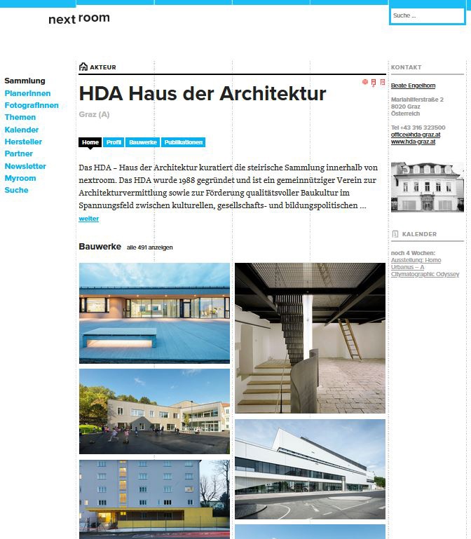 Das HDA betreut als Sammlungspartner der nextroom Architekturdatenbank die kontinuierliche Dokumentation des Architekturgeschehens in der Steiermark. Die Datenbank „nextroom“ präsentiert realisierte Projekte hoher baukünstlerischer Qualität beziehungsweise baukultureller Relevanz in Form eines langfristig verfügbaren Archivs, das zeitgenössische Architekturen in Österreich und darüber hinaus abbildet und zugänglich macht. ArchitektInnen können jederzeit in den letzten zwei Jahren fertiggestellte Projekte einreichen.