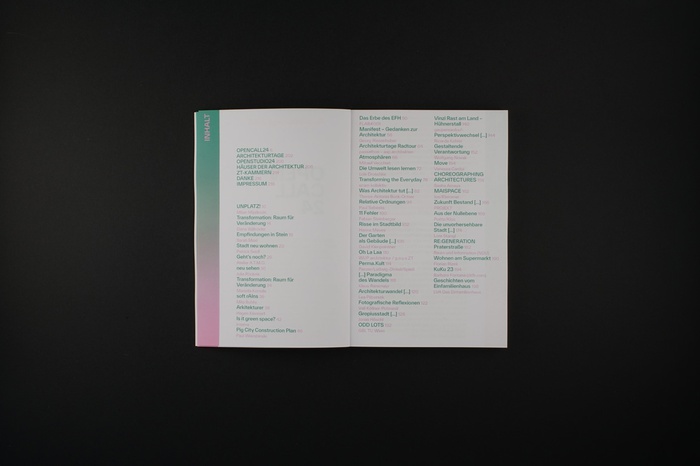 Mit Beiträgen von: Atelier A.T.M.O., Barbara Fontana (dtflr.com), David Kienpointner, Elena Willroider, Fabian Steinberger, FLAB#001, Florian Rizek, gaupenraub+/-, GBL TU Wien, Georg Riesenhuber, Hagen Klennert, Hanna Meves, interna, Jonas Höschl, Jos/Klemmer, Julia Rückeis, Klaus Ransmayr, Lea Plibersek, Lore Stangl, Luis Druschke, LVA Das Einfamilienhaus, Mariella Kerndle, Mihael Vecchiet, Mila Bubliy, Milan Mijalkovic, Panzer/ Ludwig-Dinkel/Spieß, passathon – aap.archi-tekten, Patrick Seidl, Paul Sebesta, Paul Wiersbinski, Poëtz/Klos, PROJEKT, Raum und Information (NDU), Ricarda Kohler, Sarah Maxl, Sasha Amaya, scam kollektiv, Theres-Antonia Bock-Ortner, Vali Köllner-Potmesil, Vanessa Cardui, Wolfgang Novak, WUP architektur / g.o.y.a ZT