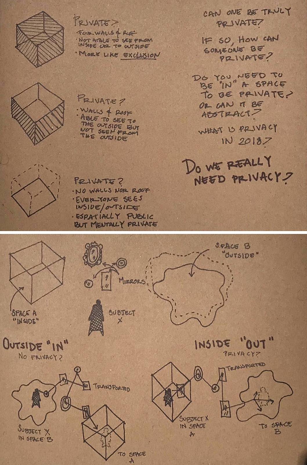 "Privacy - the paradox of our times; we enclose ourselves in four walls and a roof to have privacy, but we use social media to share our lives with the world. We show where we are, what we eat and who we hang out with through a screen. We close our sheers to cover the windows, to open another one and let the outside come inside. Part of the objective of architecture is to provide people shelter and a sense of being disconnected from the outside world, but as time goes by walls are vanishing and keeping us connected 24/7 to everything and everywhere. Do we really need privacy in our lives? Or is just a concept that we use to our own convenience?