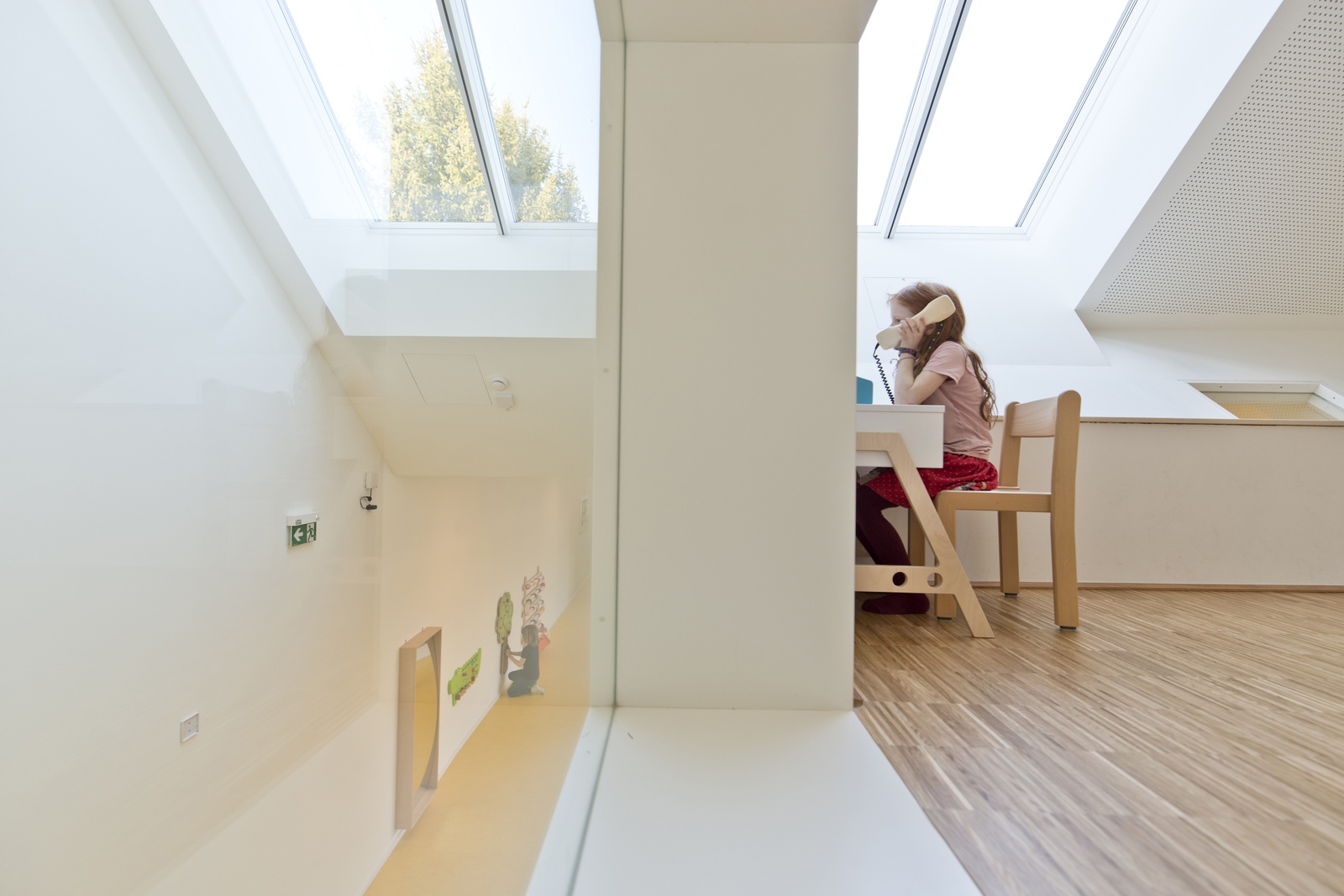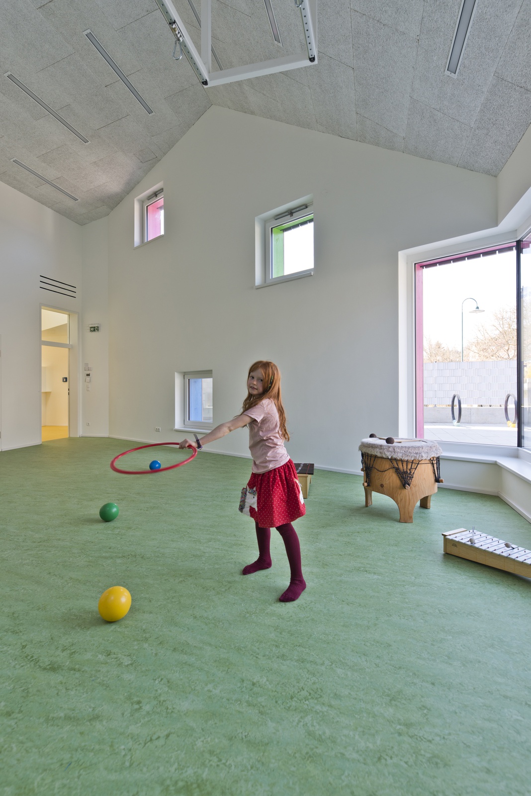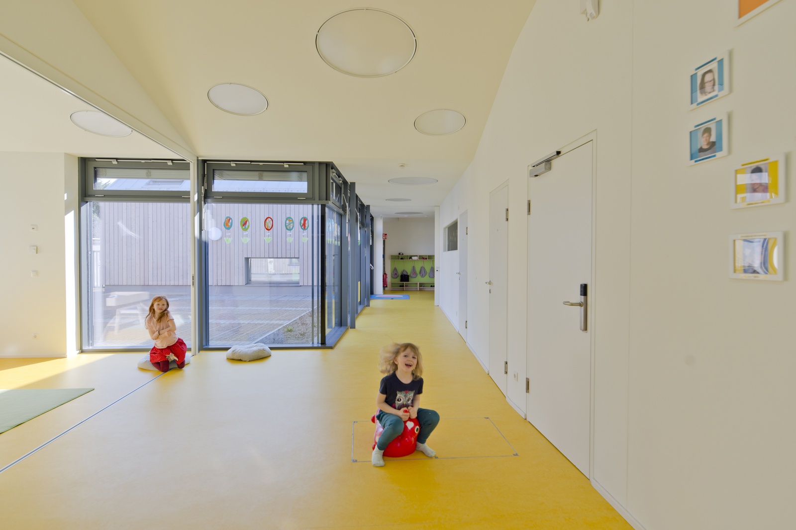 Ein wesentlicher Aktivator für die geistige und seelische Entwicklung der Kinder ist natürliche Belichtung und vor allem Besonnung. Deshalb wurden die Haupträume mit großzügigen Fensterflächen ausgestattet, sodass im Winterhalbjahr die wenigen Sonnenstunden ihre volle Wirkung entfalten können. Im Sommer sind die Gruppenräume durch den außenliegenden Sonnenschutz schattig und kühl.