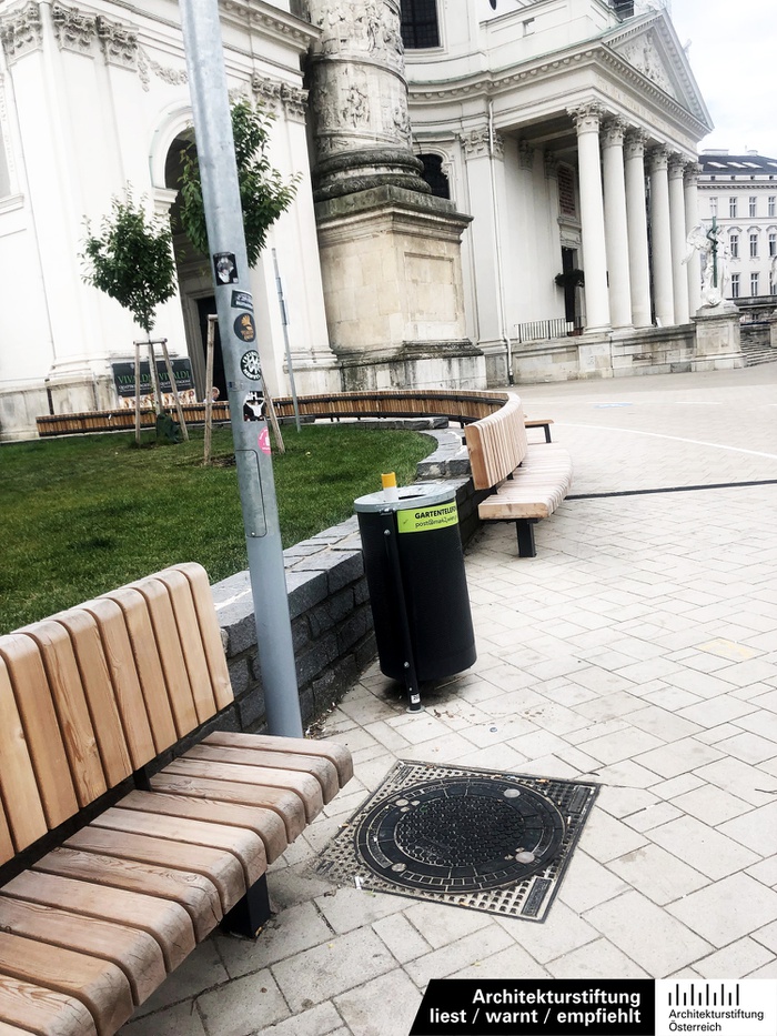 Otto Wagner wird die Äußerung zugeschrieben, der Karlsplatz sei kein Platz, sondern eine Gegend. Die Erweiterung des Wien-Museums wäre eine Gelegenheit gewesen, an diesem Umstand etwas Substanzielles zu ändern. Mit der Entscheidung, die Erweiterung als Aufstockung des Bestands und nicht als städtebauliches Projekt zu realisieren, hat man diese Gelegenheit für die nächsten hundert Jahre vertan. In diesem Umfeld treibt auch die Stadtmöblierung seltsame Blüten. Die elliptischen Pflanzflächen im leicht abschüssigen Gelände sind nicht einfach zu bespielen. In der Sitzfibel, die der Stadt Wien seit 2021 als Richtschnur für Stadtmöblierung dient, hätten sich Beispiele gefunden, mit solchen Situationen umzugehen. Aber vor der Kulisse der Karlskirche musste es offenbar etwas „Besonderes“ sein. Der verantwortliche Freiraumplaner Karl Grimm entschied sich für ein Produkt aus dicht geschlichteten, an den Enden abgerundeten Holzblöcken, die auf einer Stahlunterkonstruktion montiert sind. Dass man auf diesem Querschnitt nicht länger als fünf Minuten sitzen kann, mag Absicht sein, um Touristen auf Trab zu halten. In Kombination mit den abgestuften Bruchsteinmauern aus den 1970er-Jahren und